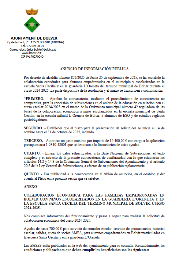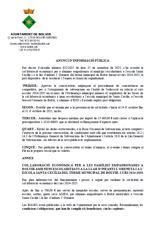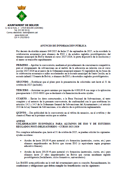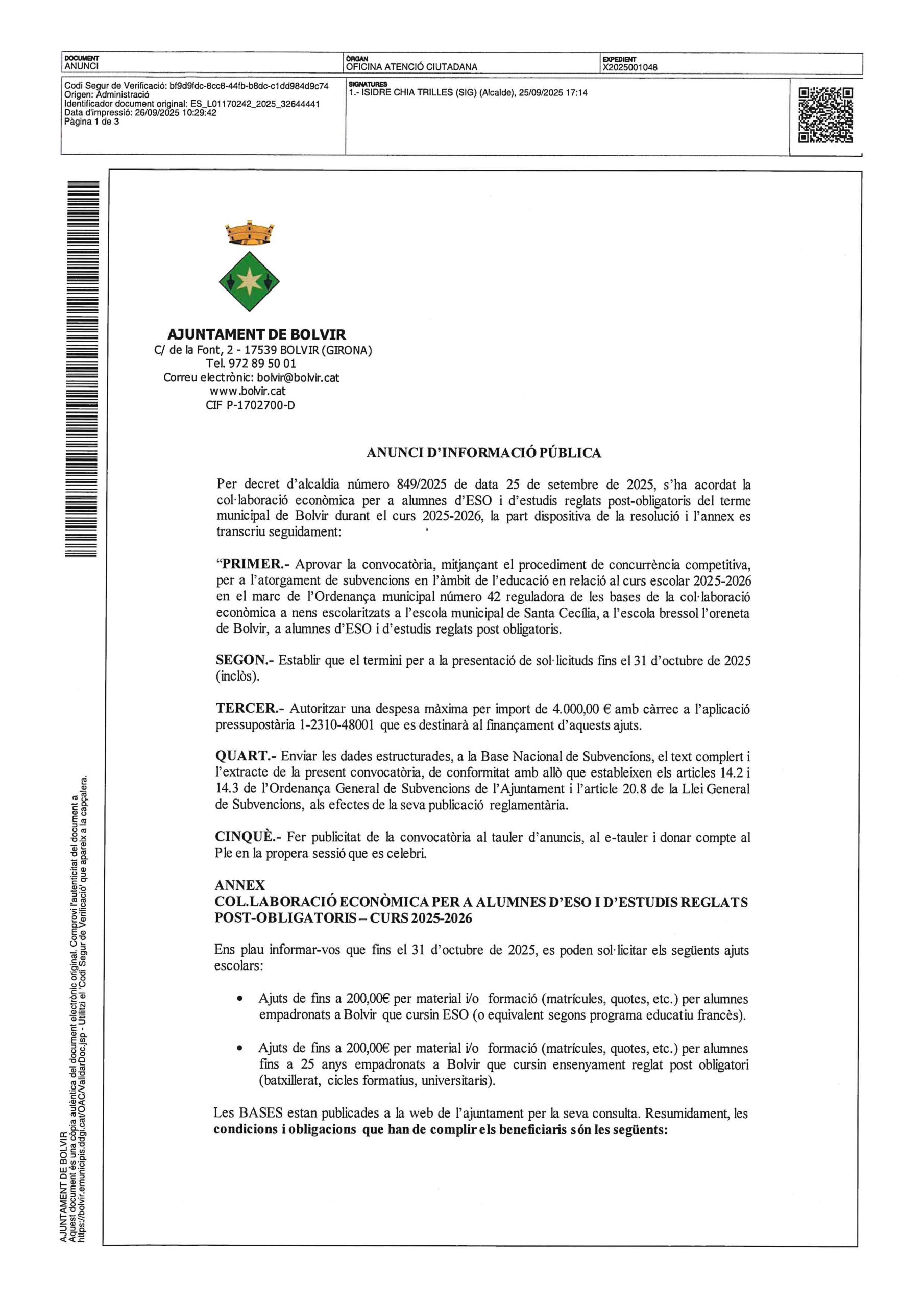 ANUNCI CONVOCATORIA AJUTS ESCOLARS ESO I UNIVERSITARI CURS 2025-2026