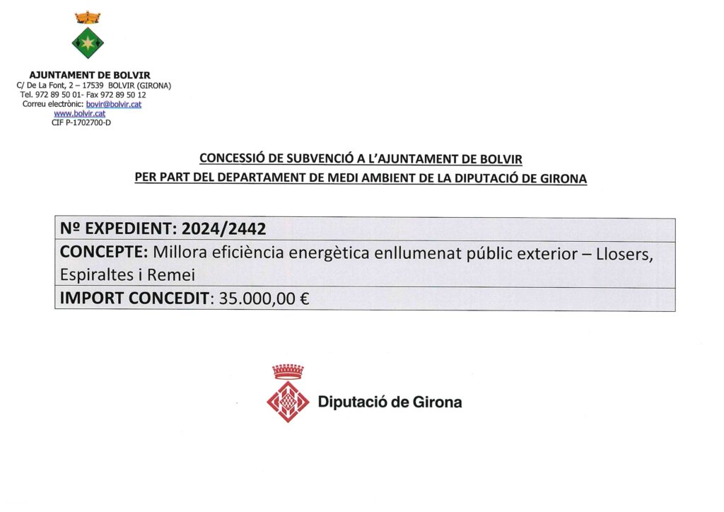 Actualitat, Agenda i Notícies SUBVENCIÓ CONCEDIDA PEL DPT. DE MEDI AMBIENT DE LA DIPUTACIÓ DE GIRONA < Entrada AnteriorEntrada Posterior >