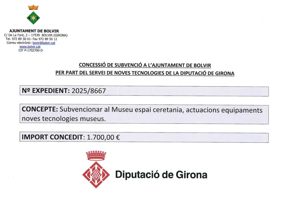 Actualitat, Agenda i Notícies SUBVENCIÓ CONCEDIDA PER PART DEL SERVEI DE NOVES TECNOLOGIES DE LA DIPUTACIÓ DE GIRONA 17/11/2025 - 31/01/2026 < Entrada AnteriorEntrada Posterior >